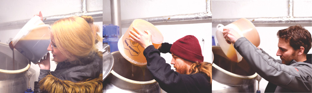 Das Ziel war, ein Honigbier zu brauen, das nicht übermäßig stark ist, aber trotzdem deutliche Honigaromen hat. Da der Honig auch vergoren wird, musste der dabei entstehende Alkohol einkalkuliert werden. Deswegen wurde das Bier leichter eingebraut, aber dafür mit jeder Menge Karamellmalz (Caraamber®). Als Aromohopfen haben wir den Hallertauer Melon ausgewählt, da er ein schönes Honigmelonen-Aroma mitbringt. Den Hopfen haben wir zusätzlich im Lagertank noch ziehen lassen um möglichst viele Aroma rauszulösen. Beim Honig hatten wir das Glück, dass ein Imker aus unserem Ort noch eine große Portion Waldhonig übrig hatte. Waldhonig deswegen, weil er ein intensiveres Aroma als Blütenhonig hat. Wir sind mit dem Ergebnis sehr zufrieden. Die Hopfenaromen harmonieren sehr gut mit dem Honigaroma.